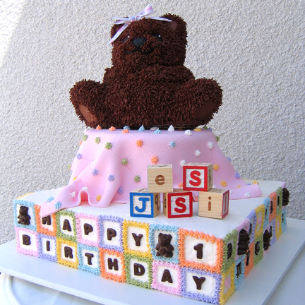 For the bear I simply used a 3-D bear pan and a "grass" piping tip to make the fur out of buttercream. (One person at the party thought that it was a real teddy bear.) The baby blanket was made from rolled fondant cut into a square and scored with a fabric scoring wheel to make the stitched look. I used candy molds to make the milk chocolate letters, numbers and teddy bears for the blocks on the sides of the cake. The bow is real and so are the blocks that spell out "Jessi". I simply ran out of time to make my own fondant blocks. It's a shame because the colors don't quite match.