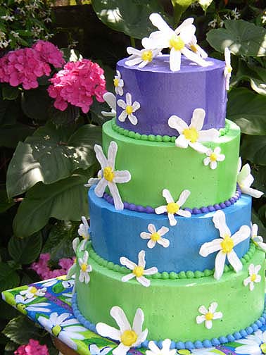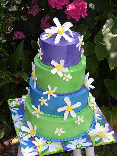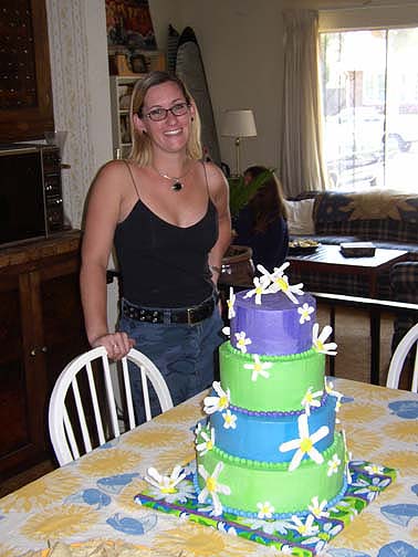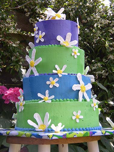 This is the cake I made for my sister, Denise's, 26th birthday on July 14th, 2002. It is version of the tiramisu cake I have done previously. French vanilla sponge cake with kahlua buttercream icing. The filling is comprised of kahlua and coffee concentrated soaking syrup, sweetened whipped coffee cream cheese and a generous layer of imported belgian bittersweet chocolate shavings. The daisies are made from royal icing. This cake was a lot of fun to do and I wanted the resulting design to be fresh, fun, and happy for a very special birthday. It obviously tasted good too! :-)