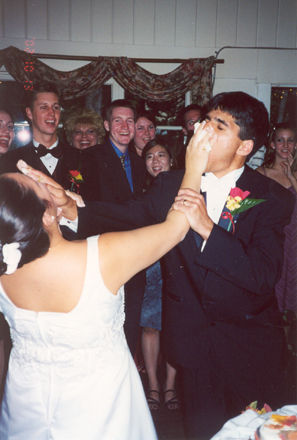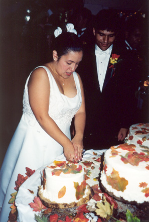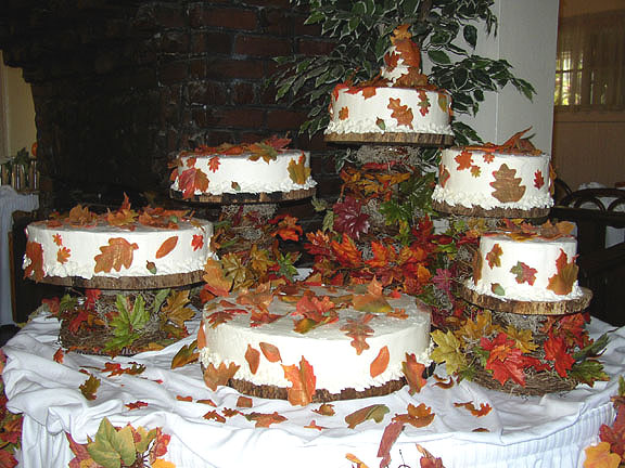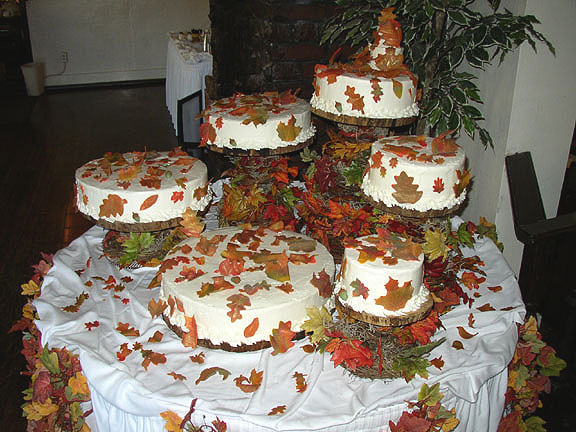 This is the wedding cake I did for my cousin, Omar, and his wife, Lela, on October 13th, 2002. Their wedding took place in a rustic hunting lodge in San Pablo, CA. The wedding theme was all about 'Fall.' So, I used the Fall theme and integrated a 'rustic' feel into the cake design as much as possible.